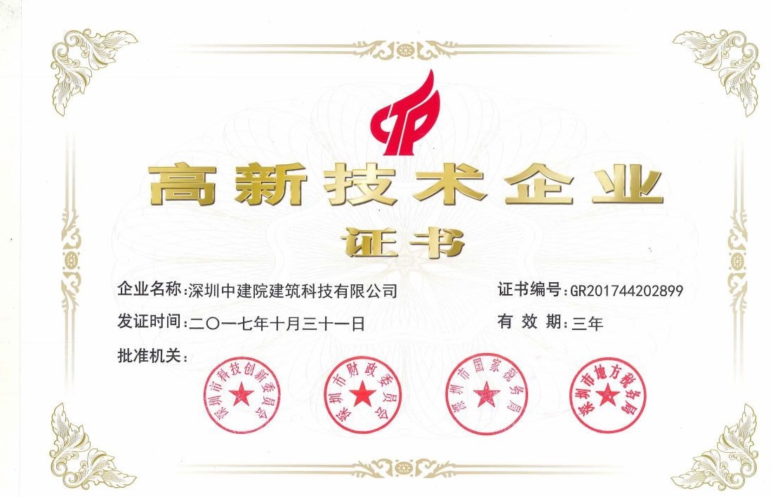 日前,全國高新技術企業認定管理工作領導小組辦公室公布了2017年深圳市第二批國家高新技術企業名單,深圳中建院建筑科技有限公司(以下簡稱“深圳中建院”)通過嚴格評審,榮獲國家高新技術企業認定(證書編號:GR201744202899)。